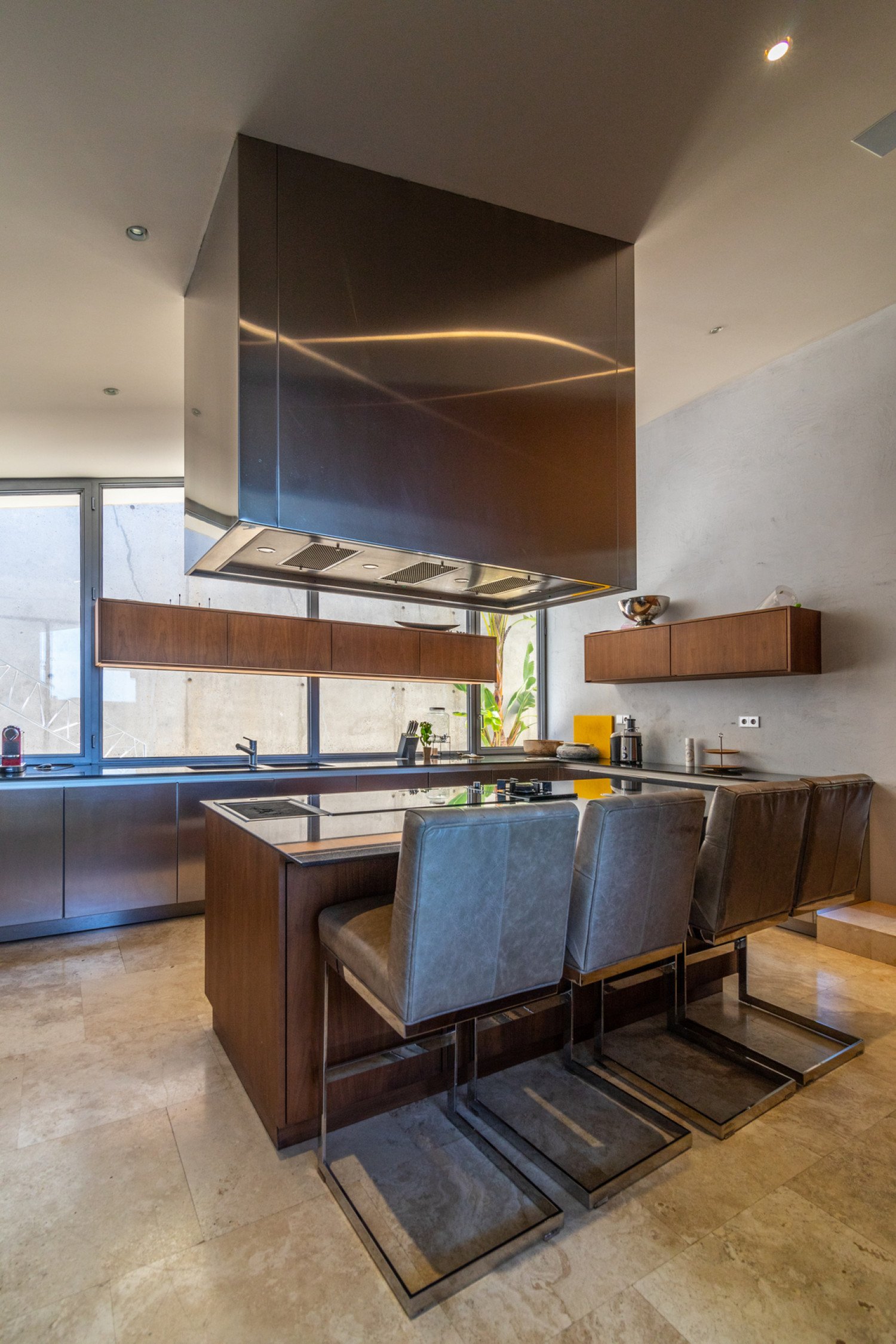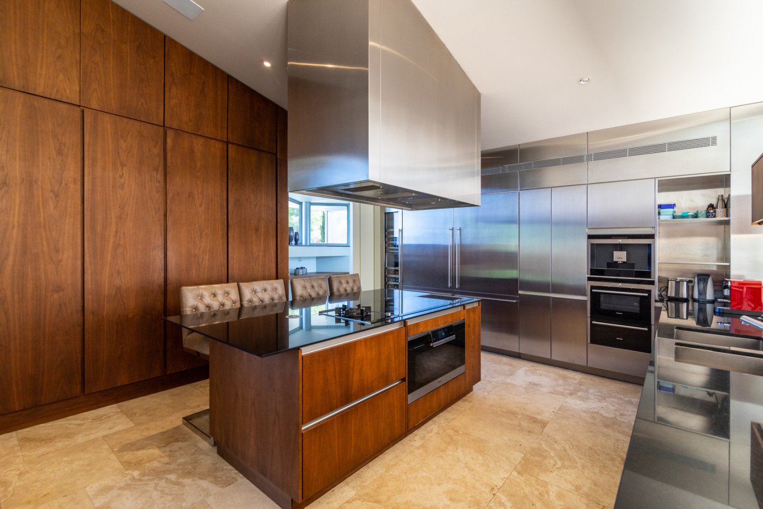 The 80 square meters living room, which also can be used as a dining room is furnished with a twelve seats dining table and in the salon area is tted with an extra-large comfortable sofa and fully equipped with a Bose unique sound system. The master bedroom suite is tted with a king bed size, an en-suite bathroom with a Jacuzzi mosaic decorated, a walk-in clo- set and a direct access to the terrace and the pool. There is two other suite bedrooms with double size beds and en-suite bathrooms both exposed to the stunning panoramic view. The two remaining bedrooms each with a double size bed share a connec- ted lounge and bathroom. Like the rest of the villa, all the bedrooms are styled with designed furniture, geometric-patterned rugs and polished stone. The property is exclusively equipped with under oor heating, air conditioning, lighting system for the external areas and the swim- ming pool, alarm security system, high speed internet connection, a state-of-the-art sound system, a Bose sound system on the terraces and a Bowers & Wilkins sound system on the other rooms. The sleek ergonomic and modern kitchen is fully equipped with high standard appliances by Gaggenau and has its own breakfast bar and wine fridge.