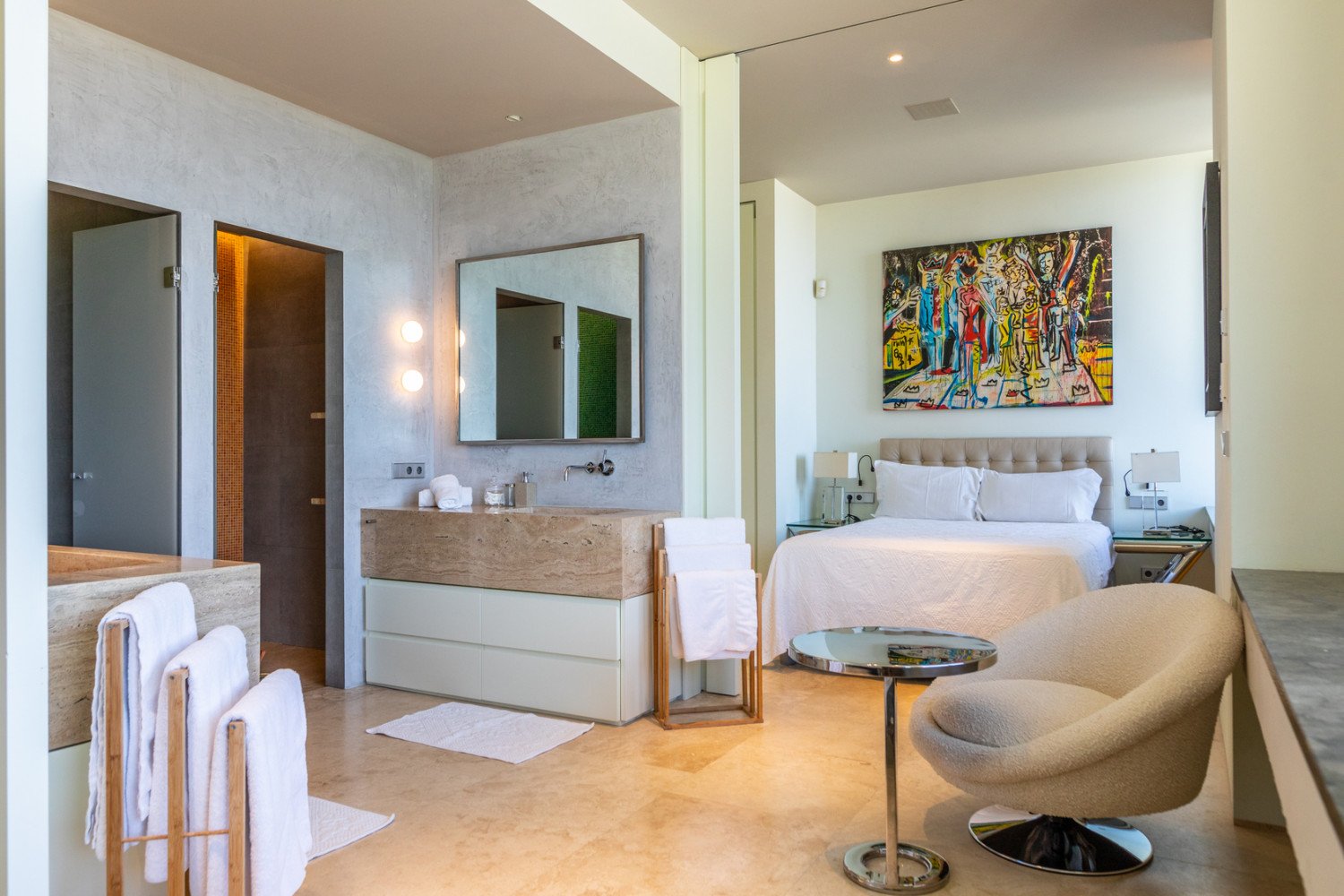 On the first floor you can find the spa equipped with Hamman, bath, shower and sauna cabin. There’s also the Mediterranean garden with the in nity pool, a hot tub, a BBQ, three terraces and a chill out area on rooftop terrace, all overlooking the crystal clear Balearic sea.