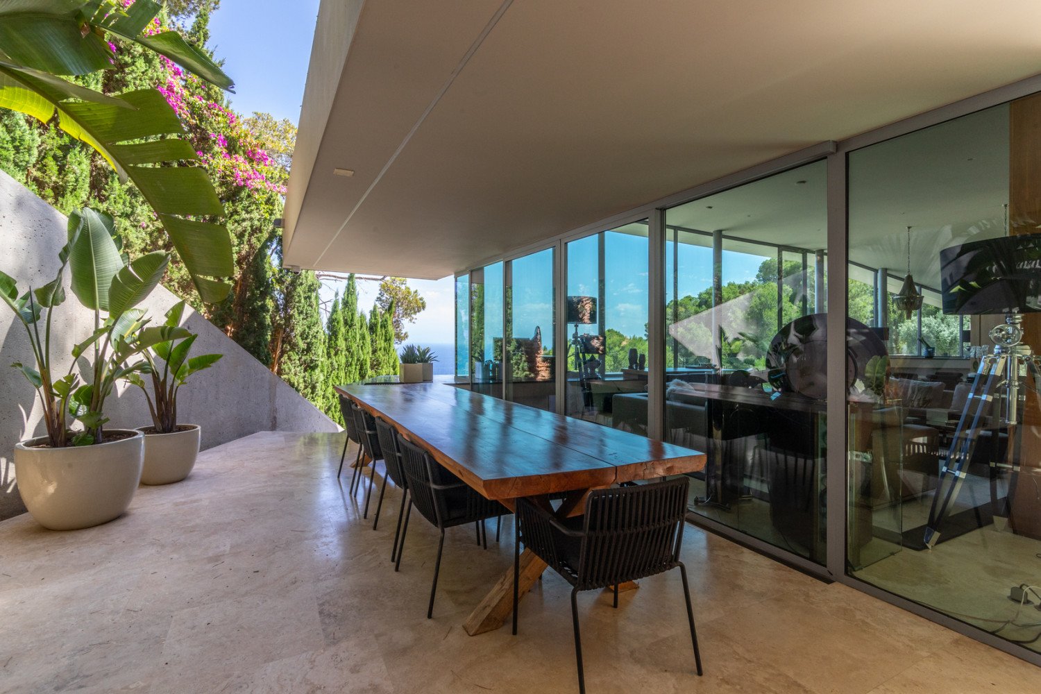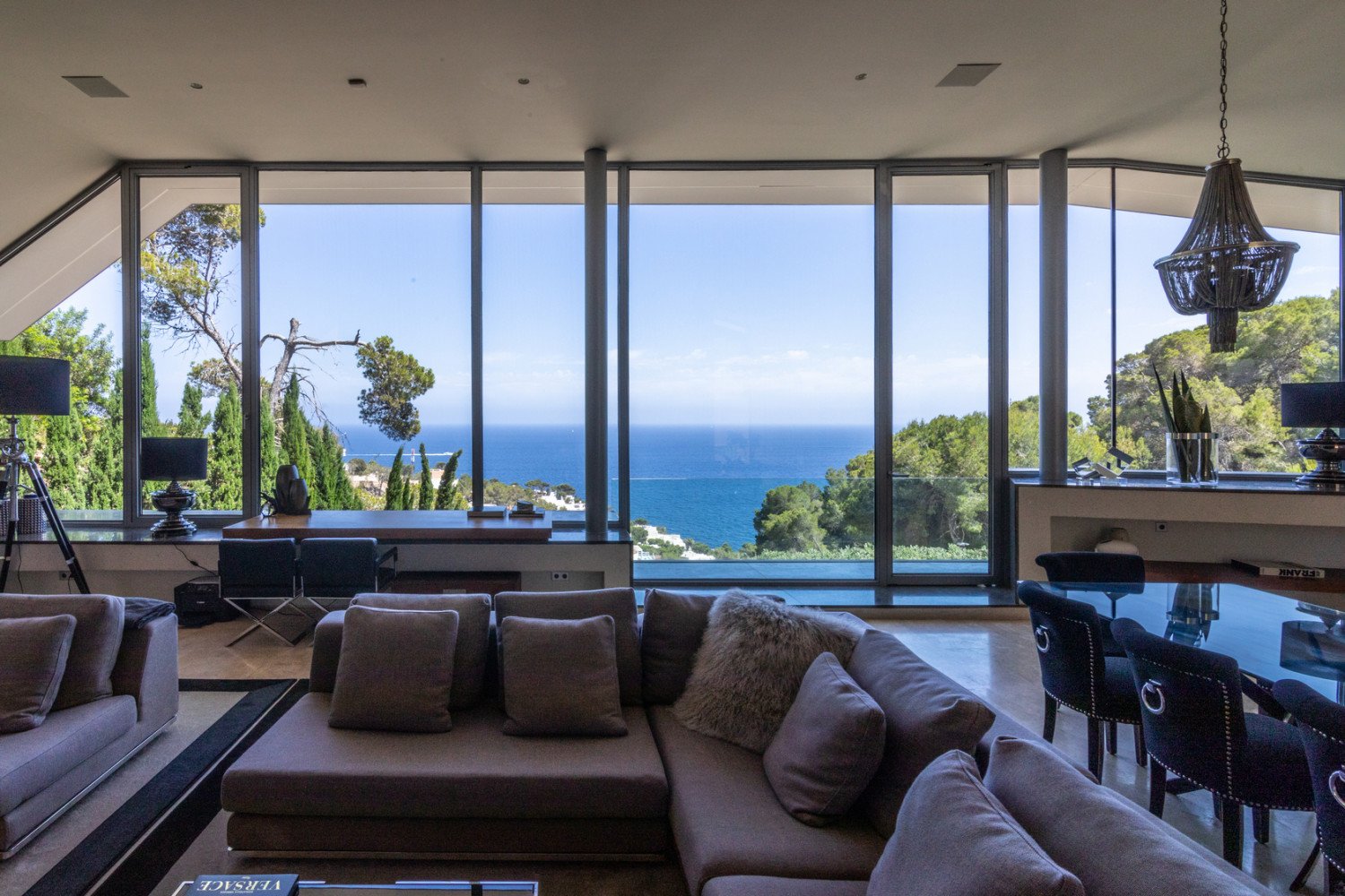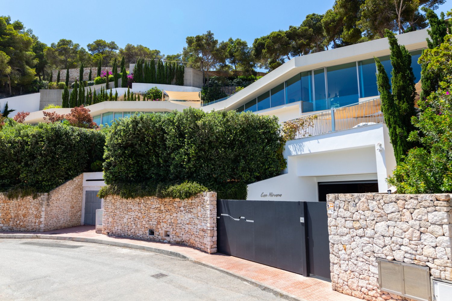 Located just a few kilometres from the centre of Ibiza, the prestigious ve-bedroom villa sits high on the hillside of the exclusive Roca Llisa residential area. Designed by notorious architect Jordi Carreño, the villa is an enclave of luxu- ry and peace that blends with the surrounding countryside and breath-taking scenery of the Mediterranean Sea.
