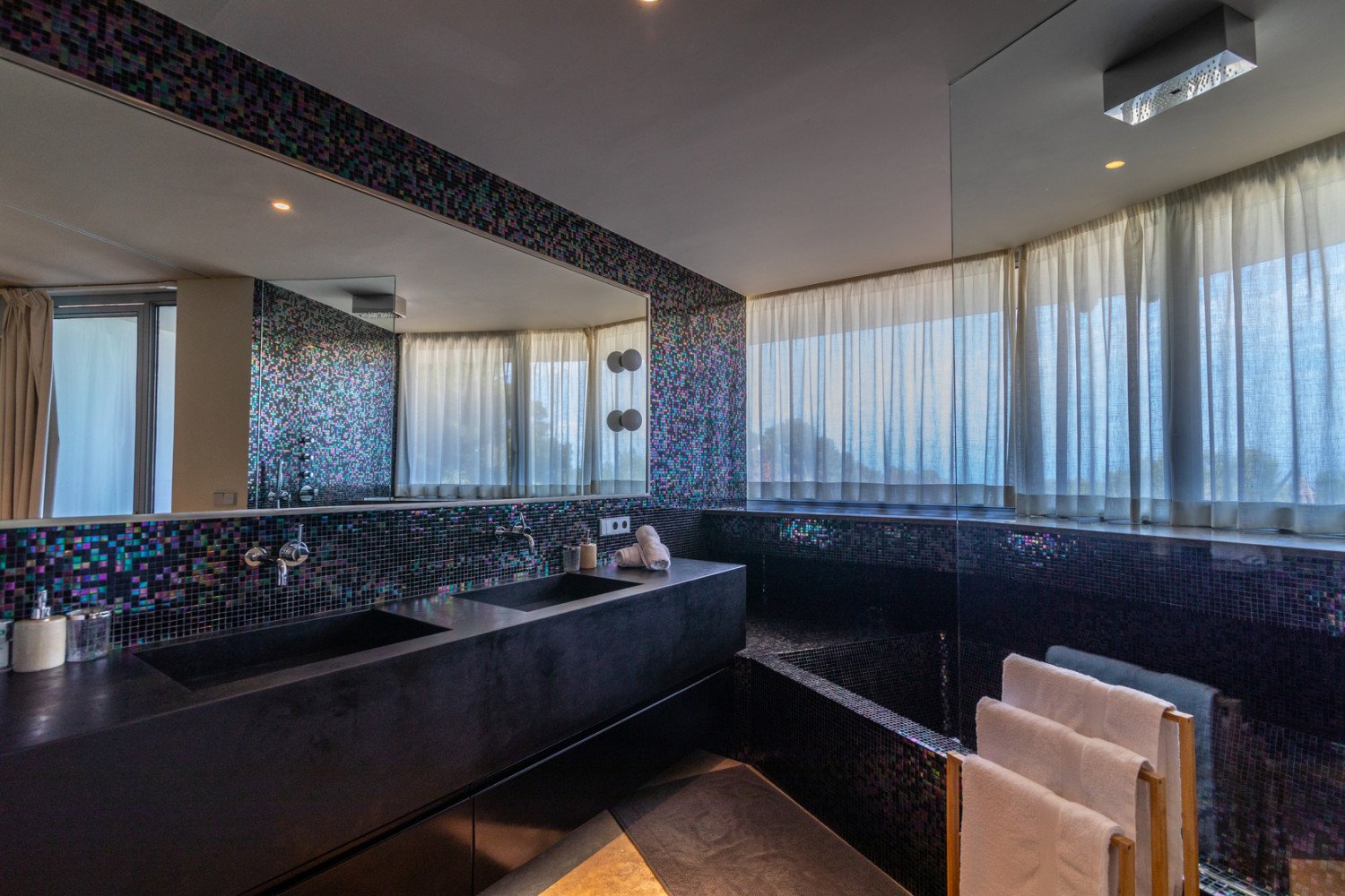 The villa’s interiors created by Paul Davies London are the archetype of open architecture; with sophisticated blend of classic and contem- porary lines styled with artwork of exquisite taste. Roca Llisa is perfectly suited for relaxing, entertaining and more...Treat yourself with a Hamman session or sunbath around the pool and the sun- ny lounge. Entertain your guests with the home theatre system or enjoying a cocktail at the bar or having a chill on the rooftop terrace. The main living area is a wide and bright open plan with high ceiling and an impressive glass bay overlooking the sea on one side; the other side mounted with a luxuriant wood panelling integrated with hidden storage space.